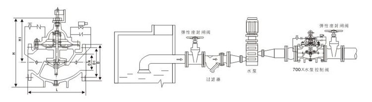 700X pump control valve consists of the main valve, solenoid pilot valve, needle valve, ball valve, check valve, travel switch, microfilter and pressure gauge hydraulic control system to take over. Pump to stop working, the first by the import pressure to close the main valve 90%, the pump stopped running. The remaining 10% is turned off by the backwater. Water hammer can prevent the phenomenon.